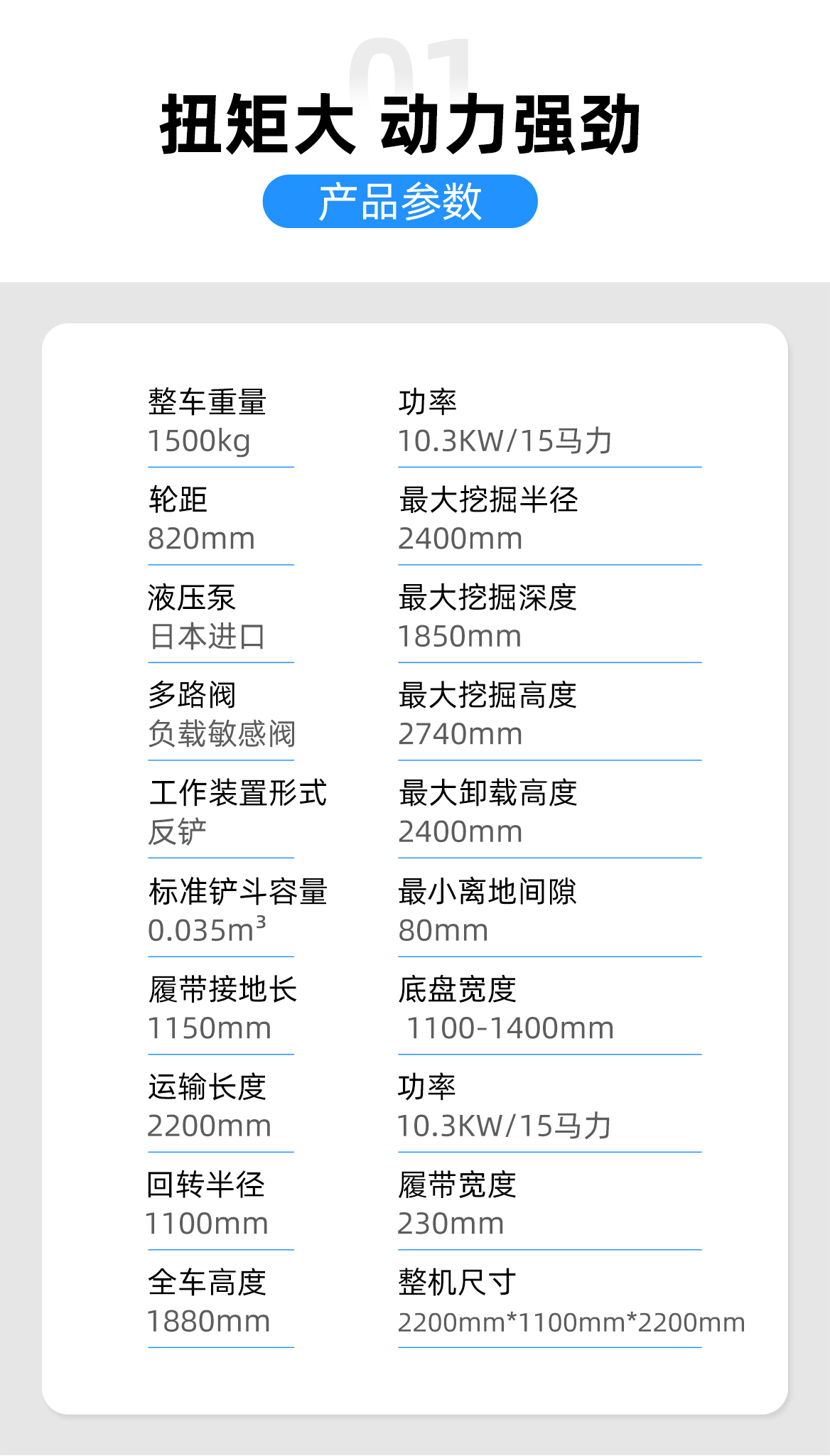 | 最大挖掘半径 | 2400mm | 履带宽度 | 150mm |
